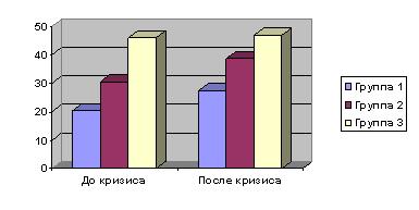 Рис.1. Соотношение уровней сплоченности в группах. Группа 1, 2, 3 – преподавательские коллективы школ г. Москвы, г. Орла и г. Твери соответственно.